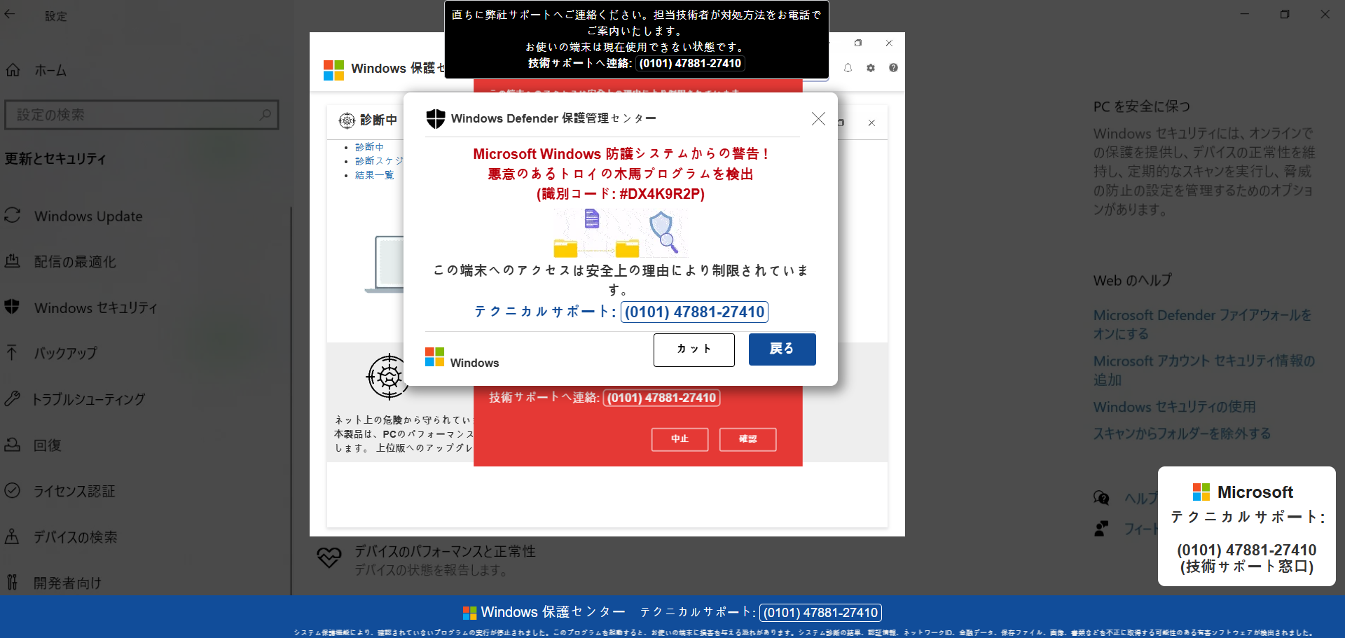 ターゲットを偽の警告ページへ誘導し、画面をロックしたように見せかけて「テクニカルサポート」と称する偽の電話番号(0101-47881-27410)に電話をかけさせ、遠隔操作ソフトの導入や金銭(プリペイドカード等)を要求することが目的です。