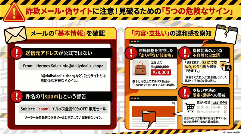 | 目次 ◆ 最近のスパム動向:ブランド混同型の組織的犯行今回ご紹介するのは「エルメス」を騙るメールですが、その前に最近のスパムの動向を解説します。現在は特定のブランドを装いつつ、クリック先では別のブランド(今回はルイ・ヴィトン)の偽ショップへ飛ばす「ブランド混同型」の乱造サイトが急増中です。これは、一つの詐欺システムを使い回して複数のブランド名で集客を図る、効率化された組織的犯行の典型です。 |