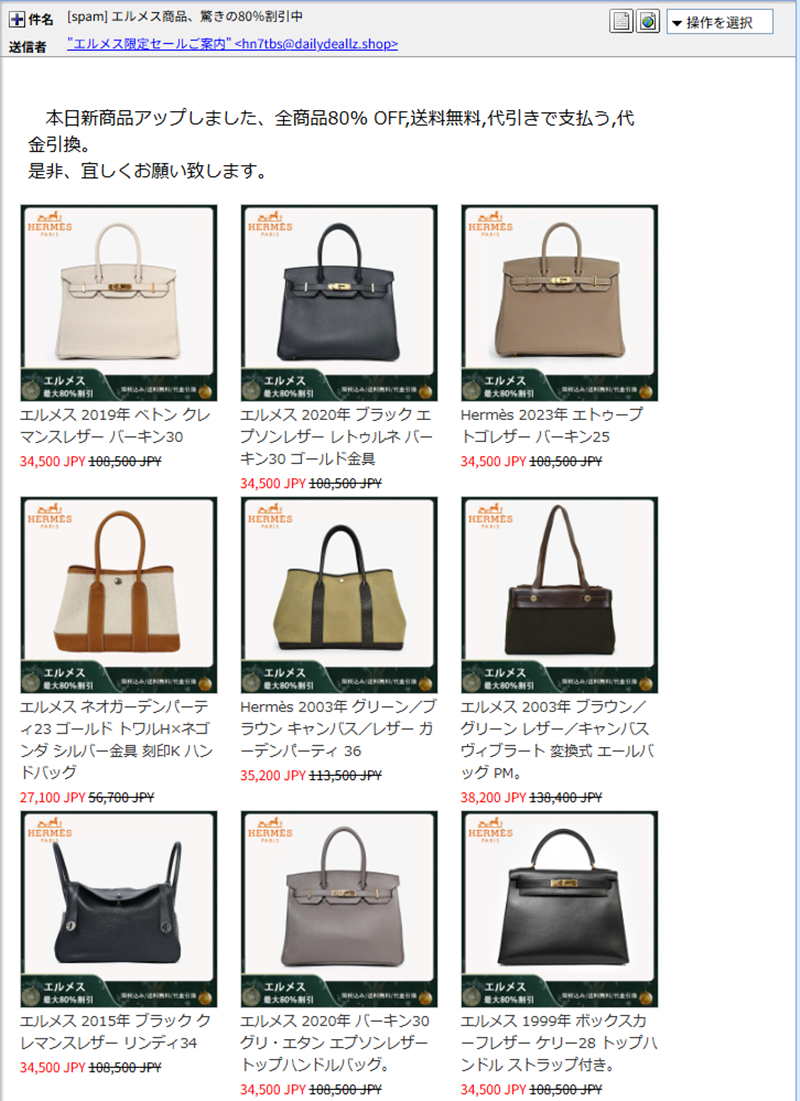 【実録】「[spam] エルメス商品、驚きの80%割引中」公開解析レポート