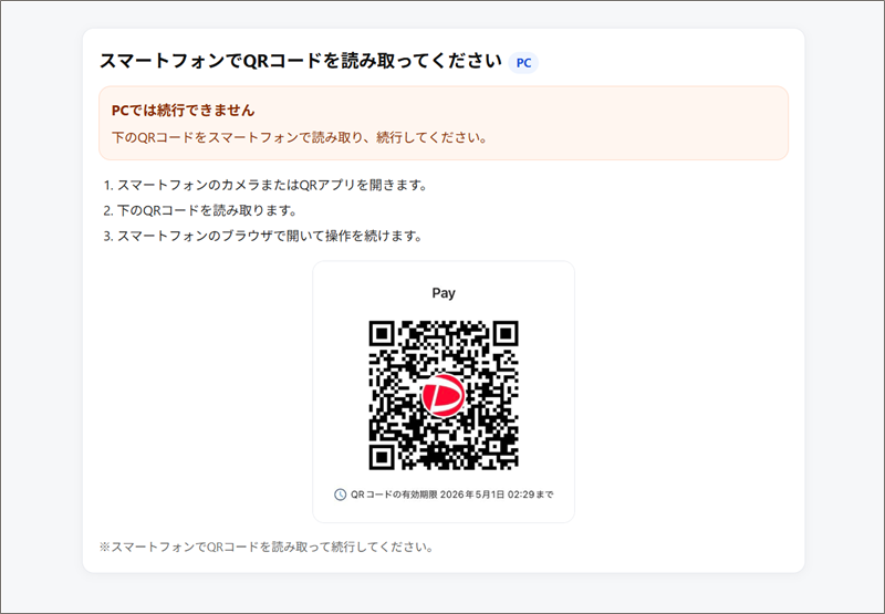 アクセスすると「スマートフォンでQRコードを読み取ってください」と表示されます。