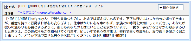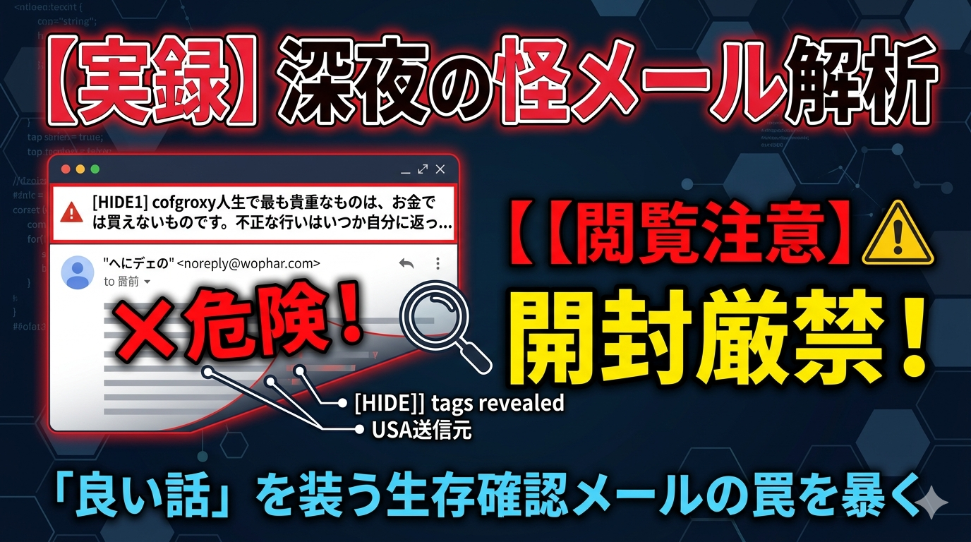 【注意喚起】善意を装う「生存確認スパム」の正体と開封のリスク | | 1. 実際に届くメールの「正体」を見極める 今日は怪しく危険なメールも少なそうなので今回はこのメールを深堀り。  なんかポエムのようなメールですが、件名だけでなく本文の冒頭から『[HIDE1][/HIDE1]』とどことなく怪しいですよね。 まず、お手元に届いたメールの「送信者情報」と「内容」を照らし合わせてみてください。以下の特徴があれば、それは100%スパムです。 | 送信者表示 | へにデエの(など、意味不明な日本語) | | 返信先 (Return-Path) | noreply@wophar.com | | 送信元IP | 148.178.241.35(米国) | まずは「[HIDE1][/HIDE1]」について解説していきますね。 これは犯人が使用している**「大量メール配信システム」の制御用タグ(変数タグ)**です。 本来、受信者には見えないはずのものですが、設定ミスやシステムのバグによってそのまま露出してしまっています。 これには非常に重要な「攻撃者の意図」が隠されています。 本文にもこれとは別に本文末尾にある「[HIDE2][/HIDE2]」も同様です。 メール本文をもう一度見返しておきます。 【メール本文の再現】[HIDE1][/HIDE1] cofgroxy人生で最も貴重なものは、お金では買えないものです。不正な行いはいつか自分に返っ 善意を持って行動すれば心も安らぎます。仕事ばかりに心を奪われず、家族との時間を大切にしてくださ い。…(中略)… 86143 [HIDE2][/HIDE2] | このメール、一見何の変哲もないポエムのようにも見えますが、ちゃんと裏に仕掛けがされています。 詐欺師らが何も意味のないポエムなんて送るはず無いじゃないですか(笑) 開封しただけで危険なこのメールはいったい… | メールを開封したり、画像を表示させたりした瞬間、あなたの意思とは関係なく「開封通知」に相当するデータが犯人のサーバーへ送信されます。 このメールには画像はありませんが、画像が付いている場合は画像が表示されて時点で情報が犯人の手に渡ります。■ 犯人側に渡ってしまう情報 - メールアドレスの生存確認:このメアドは「生きている」と確信されます。