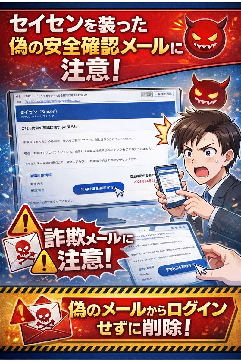 | 【閲覧注意】「【重要】セイセンアカウントの安全確認に関するお知らせ」不透明なブランド名を騙る冷酷な詐欺手口を実録公開 | 【調査報告】最新の詐欺メール解析レポート 今回ご紹介するのは「セイセン」を騙るメールですが、その前に最近のスパムの動向を解説します。4月の年度初めや新生活シーズン、多くの人が新しいサービスへの登録やカードの更新を行う時期を狙い、「アカウントの異常検知」や「安全確認」を口実にしたフィッシング詐欺が爆発的に増加しています。特に、期限を当日に設定してユーザーを心理的に追い詰め、正常な判断力を奪う手法は極めて悪質かつ典型的な攻撃パターンです。 1. 身に覚えのない「セイセン」という不透明なブランド名による緊急連絡 2. 送信元が noreply@drufmokg.nqleadgen.com という公式サイトと無縁のドメイン 3. 管理地ワシントンD.C.、稼働地香港という拠点を複雑に偽装した詐欺サイト