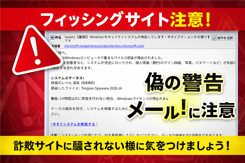 【実録】「[spam] 【重要】Windowsセキュリティシステムが破損しています」を公開!恐怖を煽る偽警告の罠を徹底解析 | 🚨 最近のスパム動向 今回ご紹介するのは「マイクロソフト」を騙るメールですが、その前に最近のスパムの動向からお伝えします。現在、OSの不具合やウイルス感染を装い、ユーザーをパニックに陥れて偽のサポート窓口(電話やチャット)へ誘導する手口が非常に活発化しています。特に「24時間以内」といった期限を設けることで、正常な判断を奪おうとするのが特徴です。 | 1行目:マイクロソフトを装い、PCのウイルス感染とシステムロックを警告する偽メール 2行目:送信元が公式ドメインを装うが、実際の発信拠点は南アフリカの一般回線 3行目:リンクは絶対に踏まず、メールを即座に削除して無視してください! | ⚠️ 【緊急】画面が消えない・閉じられない方へ 詐欺サイトはブラウザを全画面表示に固定し、操作を不能にしてパニックを誘います。以下の手順で強制終了してください。(絶対に表示されている電話番号にかけないでください!) 【Windowsの場合:タスクマネージャーでの強制終了】 1. キーボードの [Ctrl] + [Alt] + [Delete] を同時に押します。 2. 画面が変わったら 「タスクマネージャー」 を選択してください。 3. 「プロセス」タブから、お使いのブラウザ(Microsoft Edge, Google Chromeなど)を選択します。 4. 右下の 「タスクを終了」 ボタンをクリックすると画面が消えます。【どうしても消えない場合】 PCの電源ボタンを数秒間長押しして、強制的にシャットダウン(電源オフ)を行ってください。 | | ■ 【調査報告】最新の詐欺メール解析レポート | 件名 | [spam] 【重要】Windowsセキュリティシステムが破損しています:今すぐアクションが必要です | | 件名の見出し | [spam]判定あり(メールサーバーが迷惑メールとして自動検知しています) | | 送信者 | microsoft-noreply@accountprotection.microsoft.com | | 受信日時 | 2026-04-21 9:19 | | 【重要】ご覧の通り、このメールは公式サイトを装った真っ赤な偽物です。被害を未然に防ぐため、この解析結果を家族のLINEグループに転送して注意喚起してください。 | ■ メール本文の忠実な再現 お客様へ,お使いのWindowsコンピュータで重大なウイルス感染が検出されました。 このまま放置すると、システムが完全にロックされ、個人情報(銀行のログイン詳細、写真、パスワードなど)が外部に流出する恐れがあります。システムステータス: 脅威のレベル:高(致命的) 感染したファイル:Trojan.Spyware.2026.JA警告:24時間以内に修復を行わない場合、Windowsライセンスが停止されます。データの損失を防ぎ、システムを保護するために、以下のリンクから直ちにセキュリティスキャンと修復を実行してください。 [ 今すぐシステムを修復する ] 注意:このメッセージを閉じたり、PCを再起動したりしないでください。データの破損を招く可能性があります。 マイクロソフト セキュリティチーム ©2024 Microsoft Corporation | ※できる限り忠実に再現していますが、本物の詐欺メールとデザインが異なる場合もあります。 ■ 捏造された脅威:ウイルス名の正体を暴く 【解析結果:Trojan.Spyware.2026.JA とは何か?】 メール本文に記載されたこのウイルス名は、犯人がユーザーを震え上がらせるために作り上げた「完全な架空の名称」です。セキュリティ専門家の視点で分解すると、その悪質な意図が浮き彫りになります。 | Trojan | 「トロイの木馬」を指し、もっともらしい顔をして侵入する悪意あるプログラムの総称です。 | | Spyware | 個人情報やパスワードを盗み出す「スパイウェア」であることを強調し、恐怖心を煽ります。 | | 2026 | 【決定的な証拠】 今年の西暦を入れることで「最新の脅威」に見せかけています。これは詐欺師の常套手段です。 | | JA | 「Japan(日本)」をターゲットにしていることを示唆し、自分に関係があると誤認させます。 | 【結論】 Windows公式のセキュリティデータベースにこのような名称のウイルスは存在しません。本物のセキュリティソフトは、メールでウイルス名を報告して「修復ボタン」を押させるような真似は絶対にしません。この名称自体が、「100%詐欺である」ことを示す動かぬ証拠と言えます。