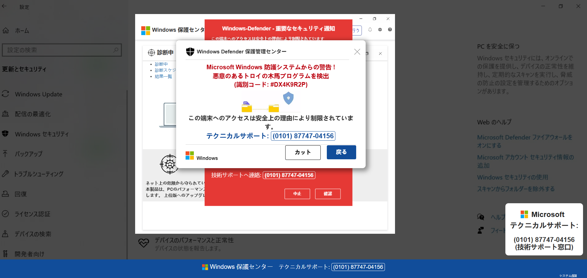 | ■ メールの目的と危険なポイント 【犯人の目的】 「システム破損」「個人情報流出」という強い言葉で驚かせ、偽のサポート窓口へ誘導してクレジットカード情報を盗む、あるいは高額な偽ソフトウェアを契約させることが目的です。【専門的な異常箇所の指摘】 ・署名の不備:公式なサポートメールにもかかわらず、問い合わせ先の住所も電話番号も記載がありません。非常に無機質で怪しい署名です。 ・脅迫的な内容:「24時間以内に修復しないとライセンス停止」という強硬な姿勢は、正規のマイクロソフトが行うことは絶対にありません。 ・送信元の乖離:アドレスこそ本物に見せかけていますが、後述する通信ヘッダーを解析すると、全く無関係な海外回線から送られていることが分かります。 | | Received: from dsl-197-245-236-2.voxdsl.co.za (dsl-197-245-236-2.voxdsl.co.za [197.245.236.2]) | | 送信元ドメイン | voxdsl.co.za | | 送信元IPアドレス | 197.245.236.2 | | 国名 | 南アフリカ (South Africa) | | ホスティング社名 | Vox Telecom | | ドメイン登録日 | 1997-02-13(長期運用ドメインの乗っ取り、または踏み台の可能性) | 【解析の根拠】 「自分の元に届いたメールが、実は海外のここから来ている」という事実に驚きを覚えるのではないでしょうか。これは送信に利用した情報であり、カッコ内のIPアドレスは信頼できる送信者情報です。マイクロソフトが南アフリカの一般プロバイダ回線からシステム警告を送るなど、あり得ない話です。 | ■ リンク先:偽サポートサイトの正体 | 誘導先URL | https://buparetiw.z38.web.core.windows.net/y79p6o***.html(伏せ字あり) | | IPアドレス | 20.150.12.102 | | ホスト名 | Microsoft Corporation (Azure Static Web Apps) | | 国名 | オーストラリア | | ドメイン登録日 | 2005-09-14(※windows.net自体はMSの物ですが、サブドメインは誰でも作成可能です) | ■ 【公開】潜入調査:偽警告サイトの正体 【リンク先サイトの状態】  ※画像は調査環境で撮影したものです。絶対にアクセスしないでください。 | 【偽物を見抜くポイント】 ・電話番号:画像内の「(0101) 47881-27410」という番号は、マイクロソフトの公式サポート番号ではありません。市外局番の形式も異常です。 ・恐怖の演出:ブラウザを全画面表示にし、ブザー音を鳴らすなどしてユーザーをパニックにさせます。これは過去の「サポート詐欺」と同様の典型的な手口です。 | ■ まとめ:身を守るための鉄則 このメールは「犯行予告」のような、ユーザーが直面する恐怖や驚きを煽るものです。絶対に相手にしてはいけません。【対処法】 1. メールは即削除、URLは絶対にクリックしない。 2. 万が一サイトを開いてしまっても、表示された電話番号には絶対にかけない。 3. ブラウザが閉じられない場合は、タスクマネージャーから強制終了するかPCを再起動してください。マイクロソフト公式の注意喚起も併せてご確認ください: マイクロソフト:テクニカル サポート詐欺から身を守る | 身近な人が騙されてからでは手遅れです。 この記事のURLをコピーして、家族のLINEグループで「これ気をつけて!」と共有してあげてください。 | |