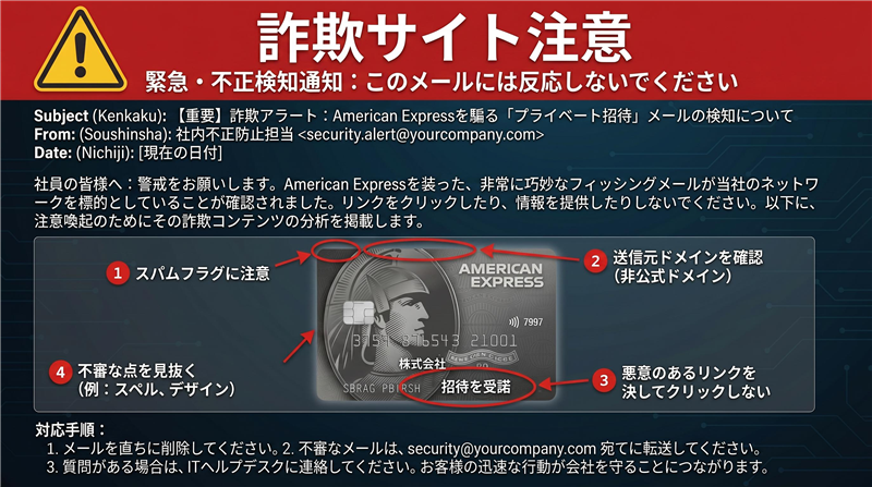過去の事例と比較しても、今回の「センチュリオン招待」はデザインの完成度が高い部類です。しかし、メールの送信元アドレス、宛名の欠如、そして1週間前に取得されたばかりの不審なドメインが、このメールの「犯行予告」とも言える危険性を物語っています。