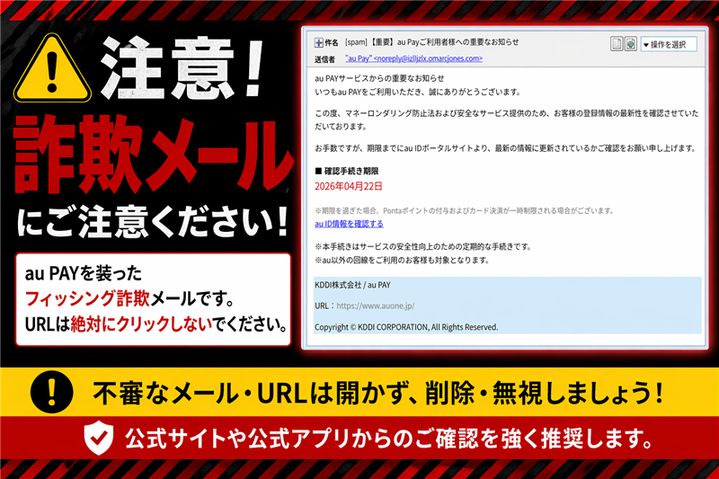 過去事例と比較しても、今回の攻撃は「正規サービスへの寄生」という、ユーザーの心理的隙を突く非常に巧妙なものです。au公式からも「マネーロンダリング等に関するご確認」という名目の不審メールについて強い警告が出ています。