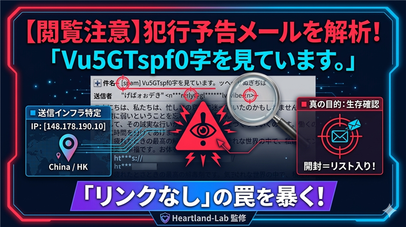 【実録】[spam] Vu5GTspf0字を見ています。ッヘザぬぎぢば 公開・閲覧注意!「リンクがない」からこそ危ない、生存確認スパムの罠 ■ 最近のスパム動向:2026年4月警戒事案 現在、名古屋を含む東海エリアを中心に、あえてリンクを貼らずに「謎のポエム」だけを送りつける不気味なメールが急増しています。これは受信者に「間違いメールかな?」と思わせて開封させることで、そのメールアドレスが「現在使われている(アクティブである)」という信号を犯人側に送る**「生存確認(リーピング)」**を目的としたものです。1か月前の警察庁なりすまし詐欺のような直接的な金銭目的とは異なり、今後の大規模攻撃に向けた「カモ名簿」の精度を上げるための高度な偵察活動です。 | 【調査報告】最新の詐欺メール解析レポート メールの解析結果:送信ドメインの矛盾と、Receivedヘッダーから判明した「中国・香港」拠点の送信インフラ | ◇ 何を装ったメールか? 善意の第三者を装い、道徳的な格言を語ることで受信者の心理的な警戒を解こうとする「マインド・ゲーム型」の不審メールです。 ◇ どこで見分けるか? 送信者名「げばォぉデき」という異常な文字列、および中国ドメイン「.cn」の使用、そして何より件名のスパムフラグです。 ◇ どう対処すべきか? 一切の反応をせず、即座に削除してください。開封すること自体が犯人への「生存報告」になります。 件名: [spam] Vu5GTspf0字を見ています。ッヘザぬぎぢば 送信者: “げばォぉデき” <noreply@globalvibe.cn> 受信日時: 2026-04-24 9:58 | ■ 送信者アドレスの徹底検証:真っ赤な偽物である証拠 送信者名に設定された「げばォぉデき」は、日本語として完全に破綻しており、攻撃者が使用する自動送信ツールによる機械的な文字生成の痕跡です。 メールアドレスのドメイン「globalvibe.cn」に注目してください。このドメインは、日本の大手企業や公的機関とは一切関係のない、中国(.cn)の安価なドメインです。 ご覧の通り、このメールは公式サイトを装った真っ赤な偽物です。被害を未然に防ぐため、この解析結果を家族のLINEグループに転送して注意喚起してください。 ■ メールのデザインと本文の忠実な再現 ※画像に基づき、不自然な改行や文字列をそのまま再現しています。 こんにちは。私たちは、忙しさの意味に迷っていたのかもしれません。ただし、他人を傷つけて得た成功は、砂の城と同じで、波に弱いということを忘れてはいけません