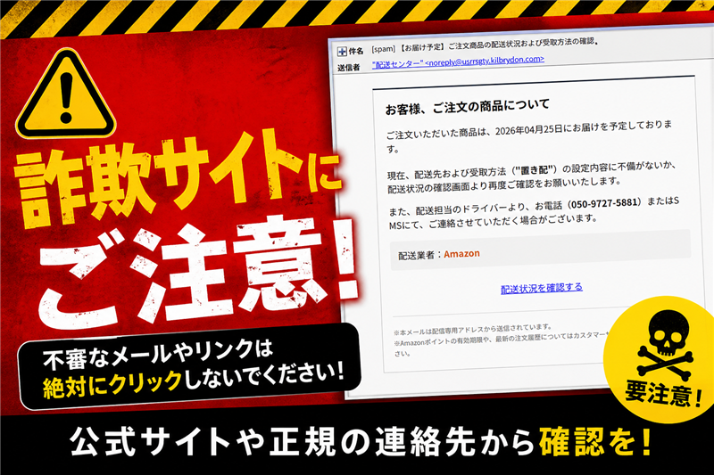 ※できる限り忠実に再現していますが、本物の詐霧メールとデザインが異なる場合もあります。 お客様、ご注文の商品について ご注文いただいた商品は、2026年04月25日にお届けを予定しております。 現在、配送先および受取方法 (“置き配”) の設定内容に不備がないか、配送状況の確認画面より再度ご確認をお願いいたします。 また、配送担当のドライバーより、お電話 (050-9727-5881) またはSMSにて、ご連絡させていただく場合がございます。 配送状況を確認する https://qyicimigmymod.t** /jp (一部伏字) ※本メールは配信専用アドレスから送信されています。 ※Amazonポイントの有効期限や、最新の注文履歴についてはカスタマーサービスにお問い合わせください。 |