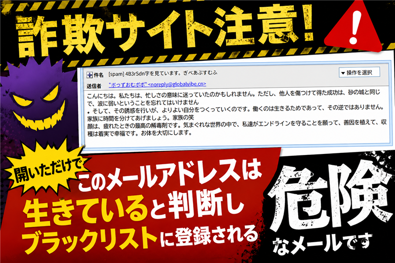 【実録】「[spam] 4B3rSdn字を見ています。ぎべあぶすむふ」 不気味なポエムが届いたら要注意!生存確認スパムの正体を公開 ■ 最近のスパム動向:静かに忍び寄る「生存確認」の罠 今回ご紹介するのは、一見するとどこにもリンクがない奇妙なメールですが、その前に最近のスパム動向を解説します。ここ1か月、確認されている手口として、フィッシングサイトへ誘導するのではなく、メールが届くかどうかを確かめる「メールアドレスの生存確認(生体確認)」が急増しています。これは、将来的な大規模攻撃のための「下調べ」として行われる極めて悪質な準備行為です。 | ◇ 何を装ったメールか? 特定の企業を騙らず、ポエムのような内容で受信者の気を引き、メールを開封させることだけを狙った「偵察型」メールです。 ◇ どこで見分けるか? 件名の意味不明な文字列、[spam]タグ、そして送信ドメイン .cn(中国)。そして何より「リンクが一切ない」という不自然さです。 ◇ どう対処すべきか? 絶対に返信してはいけません!「このアドレスは使われている」と犯人に確信させることになります。即座に削除してください。 | | 【調査報告】最新の詐欺メール解析レポート | 件名:[spam] 4B3rSdn字を見ています。ぎべあぶすむふ ※件名の先頭にある [spam] は、セキュリティサーバーがこのメールを「有害な攻撃」と断定した証拠です。 送信者:“ボつずおむポは” <noreply@globalvibe.cn> 【警告】送信者メールアドレス偽装発覚! 送信者名の「ボつずおむポは」はランダム生成された偽名です。ドメイン globalvibe.cn は公式サイトを装うためのダミーであり、中身は真っ赤な偽物です。「被害を未然に防ぐため、この解析結果を家族のLINEグループに転送して注意喚起してください。」 受信日時:2026-04-25 23:06 | | メール本文の再現(※閲覧注意) | ※できる限り忠実に再現していますが、本物の詐欺メールとデザインが異なる場合もあります。 こんにちは。私たちは、忙しさの意味に迷っていたのかもしれません。ただし、他人を傷つけて得た成功は、砂の城と同じで、波に弱いということを忘れてはいけません。 。そして、その誠実な行いが、よりよい自分をつくっていくのです。働くのは生きるためであって、その逆ではありません。 家族に時間を分けてあげましょう。家族の笑 顔は、疲れたときの最高の解毒剤です。気まぐれな世界の中で、私達がエンドラインを守ることを願って、善因を植えて、収穫は着実で幸福です。お体を大切にします。 | ■ リンクがない理由と犯人の卑劣な目的 犯人の真の目的:このメールには誘導先のリンクがありません。これは、あなたのメールアドレスが「実際に使われているか」を確認する生存確認(生体確認)が目的です。もしあなたが返信したり、開封通知が送られたりすると、犯人は「このアドレスは有効だ」と判断し、後日より巧妙なフィッシングメールやウイルス付きメールを送りつけてきます。 専門的見解:意味不明な日本語ポエムは、スパムフィルターを回避しつつ、受信者に「なんだろう?」と思わせて開封させるための「撒き餌」です。文頭の句読点異常や不自然な改行(「家族の笑」)は、海外の攻撃者が機械的に生成した証拠であり、署名や連絡先がない点も責任逃れの典型です。 | | 本レポートの根拠データ:サイト回線関連情報 | Received (送信元経路情報): from mail5.globalvibe.cn (unknown [148.178.190.5]) これは送信に利用された情報であり、カッコ内のIPアドレス [148.178.190.5] は、当ラボの解析により特定された「信頼できる送信者情報」です。 IPロケーション解析(ip-sc.netデータ準拠): 判定地点: アメリカ合衆国 (United States / California) ホスト名: mail5.globalvibe.cn 回線事業者: Global Vibe Network Tech | 【ヘッダー解析の真実】 あなたの善意に訴えかけるその言葉は、実はアメリカ・カリフォルニアにある無機質なサーバーから放流されたものです。心温まる文章とは裏腹に、発信源は冷徹な海外のサーバーファームです。