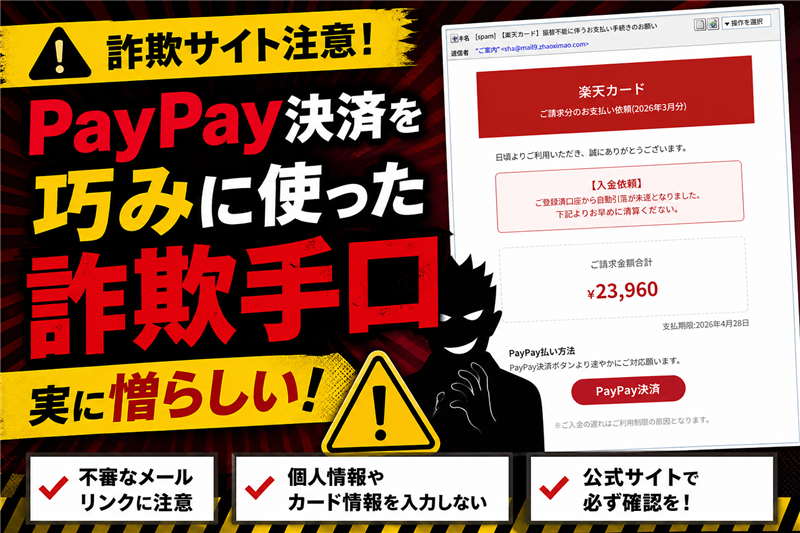 【実録】[spam] 【楽天カード】振替不能に伴うお支払い手続きのお願い 閲覧注意の偽装工作を暴く ■ 最近のスパム動向:年度替わりを狙う「未払い」の罠 今回ご紹介するのは「楽天カード」を騙るメールですが、その前に最近のスパムの動向を確認しましょう。直近1か月間は「国税庁」や「三井住友カード」の偽装が目立ちましたが、4月下旬に入り「自動引落未遂」を口実にした楽天カード型のフィッシングが急増しています。特に今回はPayPay決済を騙る新種であり、スマホユーザーを標的にした巧妙かつ杜撰な攻撃が特徴です。 | | 【調査報告】最新の詐欺メール解析レポート | | 件名 | [spam] 【楽天カード】振替不能に伴うお支払い手続きのお願い | | 件名見出し | 振替不能に伴うお支払い手続きのお願い | | 送信者 | “ご案内” <sha@mail9.zhaoximao.com> | | 受信日時 | 2026-04-26 5:28 | | 判定 | 送信者メールアドレス偽装発覚! | | ご覧の通り、このメールは公式サイトを装った真っ赤な偽物です。被害を未然に防ぐため、この解析結果を家族のLINEグループに転送して注意喚起してください。 | ■ メール本文(忠実再現) ※できる限り忠実に再現していますが、本物の詐欺メールとデザインが異なる場合もあります。 楽天カード ご請求分のお支払い依頼(2026年3月分) | 日頃よりご利用いただき、誠にありがとうございます。 【入金依頼】 ご登録済口座から自動引落が未遂となりました。 下記よりお早めに清算ください。 | ご請求金額合計 ¥23,960 支払期限:2026年4月28日 PayPay払い方法 PayPay決済ボタンより速やかにご対応願います。 ※ご入金の遅れはご利用制限の原因となります。 | ■ メールの目的と専門的解説 【目的】楽天カード利用者の「引落失敗」という不安を煽り、偽のPayPay決済画面で個人情報と決済権限を盗み取ることが目的です。 【異常点】楽天カードが公式に「PayPay決済」で未払金を受け付けることはありません。また、本文に宛名(氏名)がない点は決定的な偽物の証拠です。デザインは本物のイメージカラーを巧妙に模倣していますが、論理が破綻しています。 | | ■ 送信元の技術解析(Receivedヘッダー) | | 送信元ドメイン | mail9.zhaoximao.com | | 送信元IPアドレス | 35.203.59.14 | | ホスト名 | 14.59.203.35.bc.googleusercontent.com | | 拠点・国 | カナダ モントリオール | | ホスティング社 | Google LLC (Google Cloud) | | Google Cloudを利用するのは、犯人が自身の足跡を消すためにGoogleの巨大なクラウドインフラを「隠れ蓑」として悪用している決定的な証拠です。現代の組織的なフィッシング詐欺の典型的な手口と言えます。 | | ■ リンク先(詐欺サイト)の徹底解析 | | 誘導URL | https://about-payba●●lf.com/ (一部伏字) | | リンクドメイン | about-paybadlf.com | | リンク先IPアドレス | 104.21.6.142 | | 拠点・国 | カナダ トロント | | ドメイン登録日 | 2026-04-20 | | ドメイン登録日が数日前であることは、この詐欺のために急遽取得された「捨てドメイン」であることを示しています。 | ■ 詐欺サイトの実態(2枚目画像解析) スマートフォンでQRコードを読み取ってください | PCでは続行できません。下のQRコードを読み取り、続行してください。 | postimage Upgrade to Premium! ※画像表示制限 | | リンク先ではスマホでの操作を強要しますが、犯人が無料画像ホスティング(postimage)を悪用したため、画像表示制限により肝心のQRコードが見えないという「お粗末な状態」になっています。しかし、正常に表示されていれば被害に直結するため、絶対に読み取ってはいけません。 | | ■ 最終判定:危険度 ★★★★★ 今回のメールは、大手ブランドを複数組み合わせた高度なフィッシングですが、インフラの使い方が非常に杜撰です。過去事例と比較しても、誘導先の不完全さが目立ちますが、同様の攻撃は今後も洗練されていくでしょう。 ≫ 楽天カード公式サイト:セキュリティに関する重要なお知らせ 身近な人が騙されてからでは手遅れです。この記事を家族のLINEグループで共有し、「これ気をつけて!」と伝えてあげてください。 | |