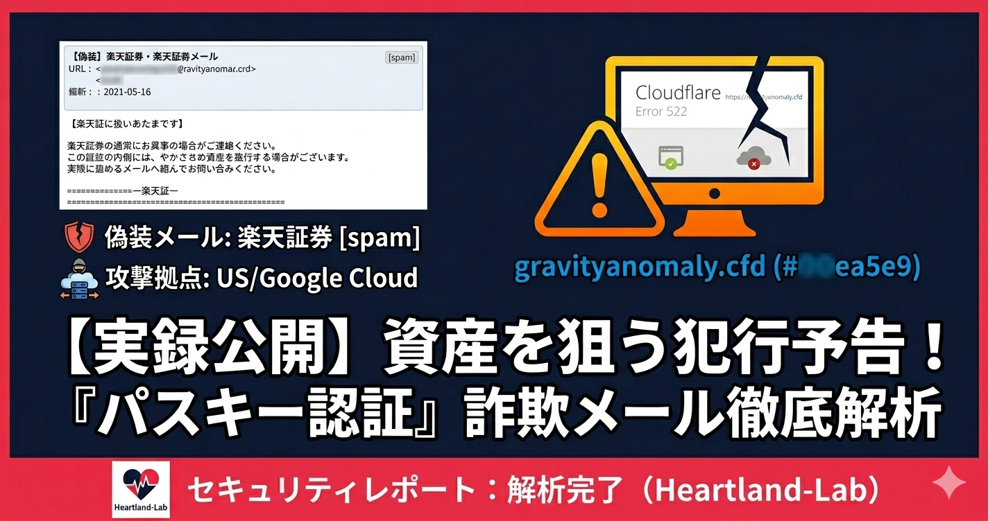 ※できる限り忠実に再現していますが、本物の詐欺メールとデザインが異なる場合もあります。 [+] 件名 [spam] 【楽天証券】パスキー認証未設定:アカウント保護のためご対応ください 送信者 “楽天証券” <service@rakuten-sec.co.jp> 平素より楽天証券をご利用いただき、誠にありがとうございます。 このたび、お客様の口座セキュリティ向上のため、重要なご案内を申し上げます。 当社では現在、より安全なログイン手段として「パスキー認証」の導入を進めております。 お客様のアカウントでは、本認証がまだ設定されていない状況を確認しております。 本機能を有効にすることで、ログイン時の本人確認が強化され、 第三者による不正アクセスや情報漏洩のリスクを低減できます。 ▼ 認証設定はこちら(所要時間:約2~3分) https://www.raku●ten-sec.co.jp/login/(※伏せ字加工・リンク無効) 設定がお済みでない場合でも、ただちにアカウントが制限されるわけではございませんが、 セキュリティ強化の観点より、早期の設定をお願いしております。 引き続き安心してご利用いただくため、お時間のあるときに設定をご検討ください。 ■会社名:楽天証券株式会社 ■本店所在地:〒107-0062 東京都港区南青山二丁目6番21号 ■登録番号:関東財務局長(金商)第195号 ■詳細情報:https://www.raku●ten-sec.co.jp ■お問い合わせ先:0120-885-696(平日 9:00~17:00 ※祝日除く) ※本メールは送信専用アドレスから配信しております。 ※お心当たりのない場合は、本メールを破棄いただきますようお願い申し上げます。 |