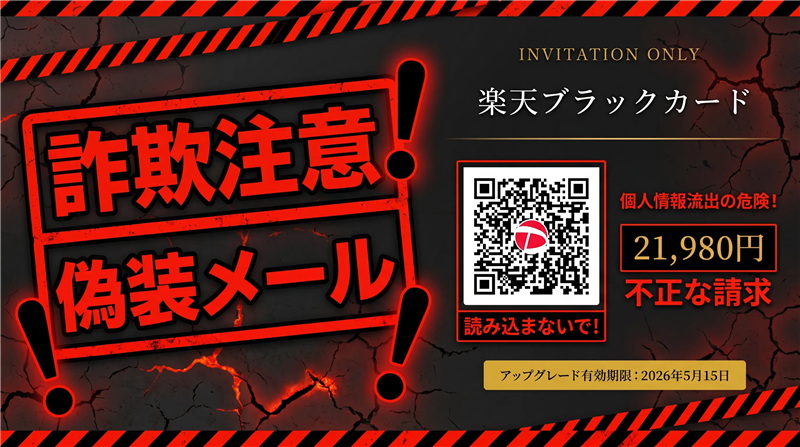 ■ 注意点と対処法 ・絶対にQRコードをスキャンしないでください。 ・楽天カードからのインビテーションは、通常公式アプリ「楽天カード」内の通知、または封書で届きます。 ・このようなメールが届いたら、開かずに即削除してください。 公式サイトの注意喚起: ≫ 楽天カード公式:フィッシング詐欺の被害にあわないために |