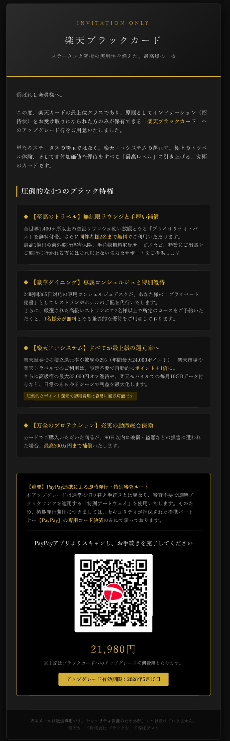 【実録・閲覧注意】楽天ブラックカード「偽」招待状の正体 ― 巧妙に隠されたPayPay送金詐欺の罠 監修:Heartland-Lab (ハートランド・ラボ) |